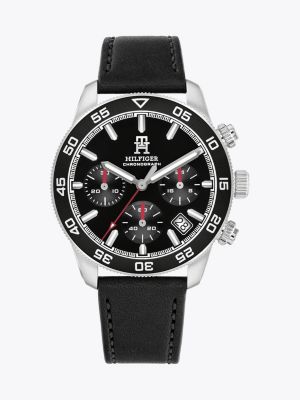 This water-resistant watch has a sleek black leather strap and sport-ready stopwatch function on the polished enamel chronograph dial.