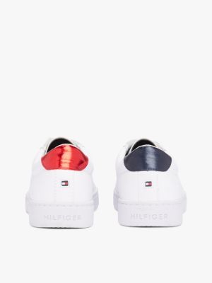 Bring a touch of shine to your off-duty outfits with these versatile low-top trainers. Designed from premium leather to a classic lace-up silhouette, they showcase an assortment of stylish branded accents. Check out the metallic heel counters in signature shades, glossy Tommy Hilfiger lace charms and iconic flag detailing.